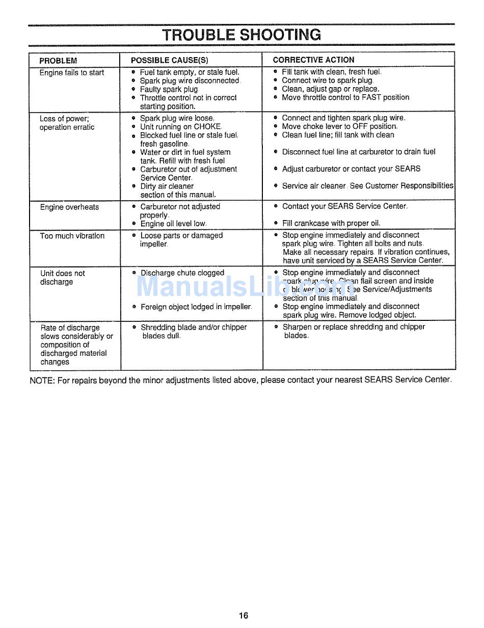 NOTE: For repairs beyond the minor adjustments listed above, please contact your nearest SEARS Service Center.
