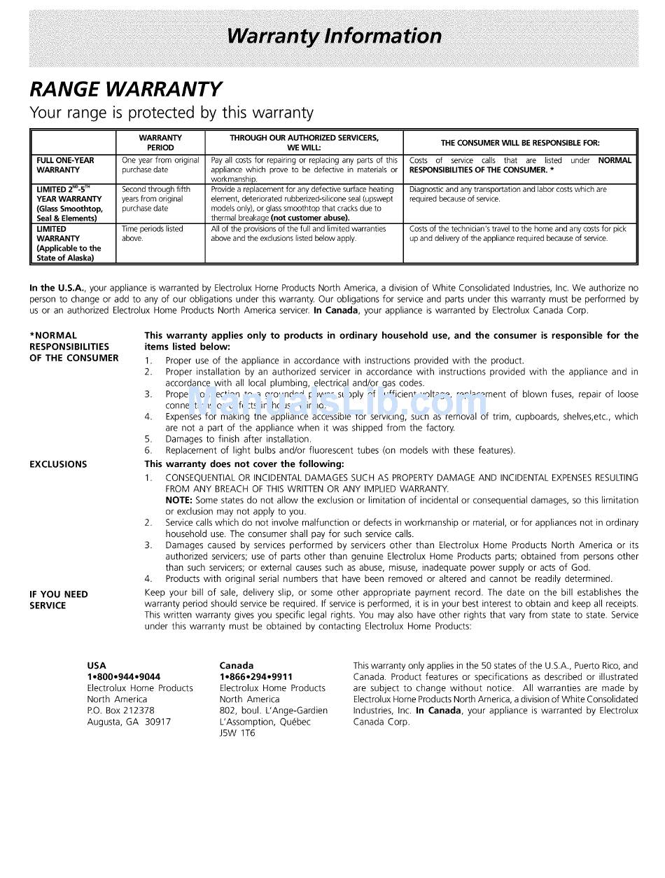 us or an authorized Electrolux Home Products North America servicer. In Canada, your appliance is warranted by Electrolux Canada Corp.