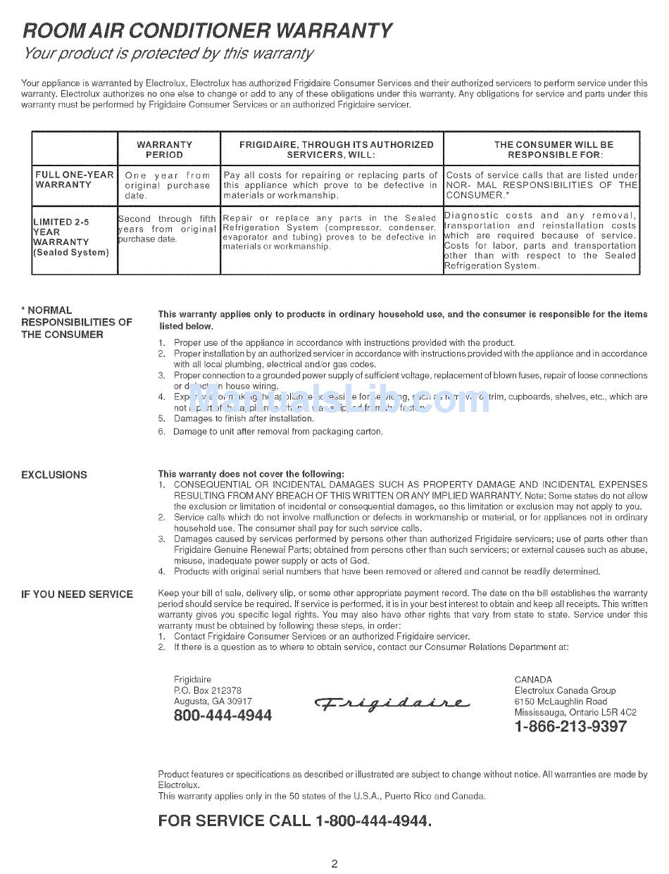 warranty must be performed by Frigidaire Consumer Services or an authorized Frigidaire servicer.