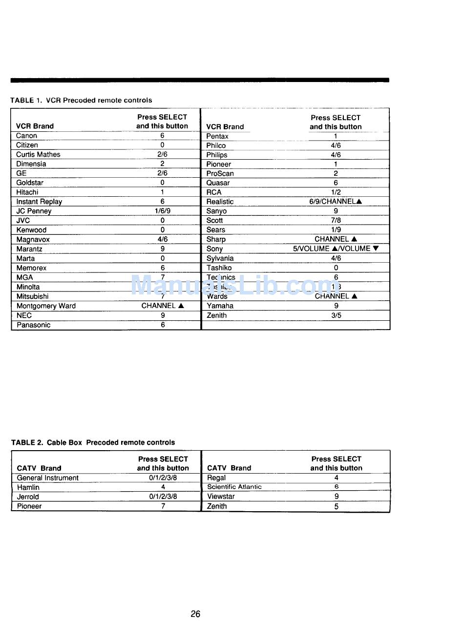 TABLE 1. VCR Precoded remote controls