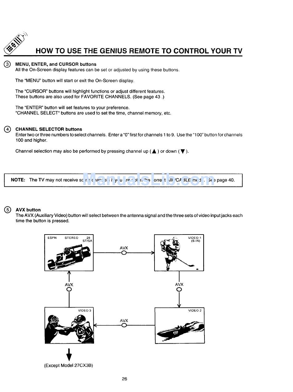 The AVX (Auxiliary Video) button wilt select between the antenna signal and the three sets of video input jacks each