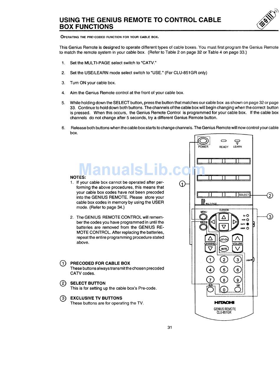 This Genius Remote is designed to operate different types of cable boxes. You must first program the Genius Remote