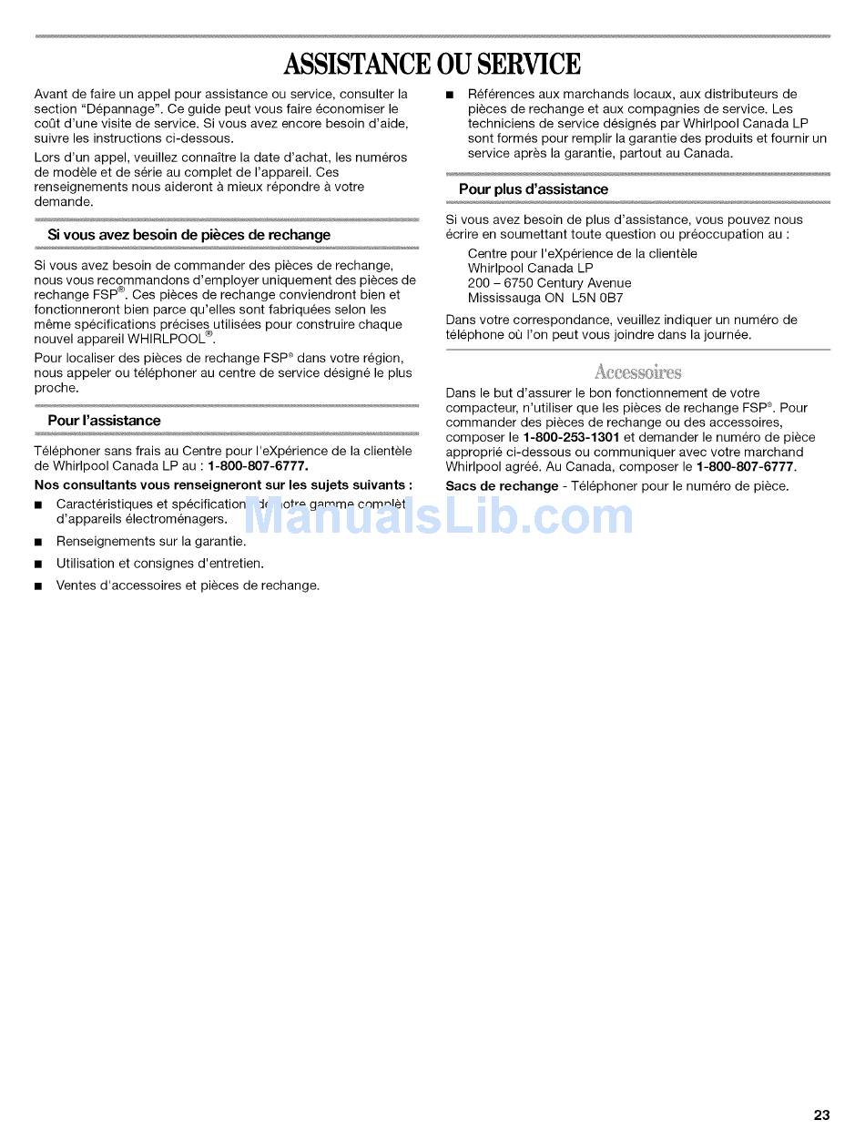 de Whirlpool Canada LP au • 1-800-807-6777.