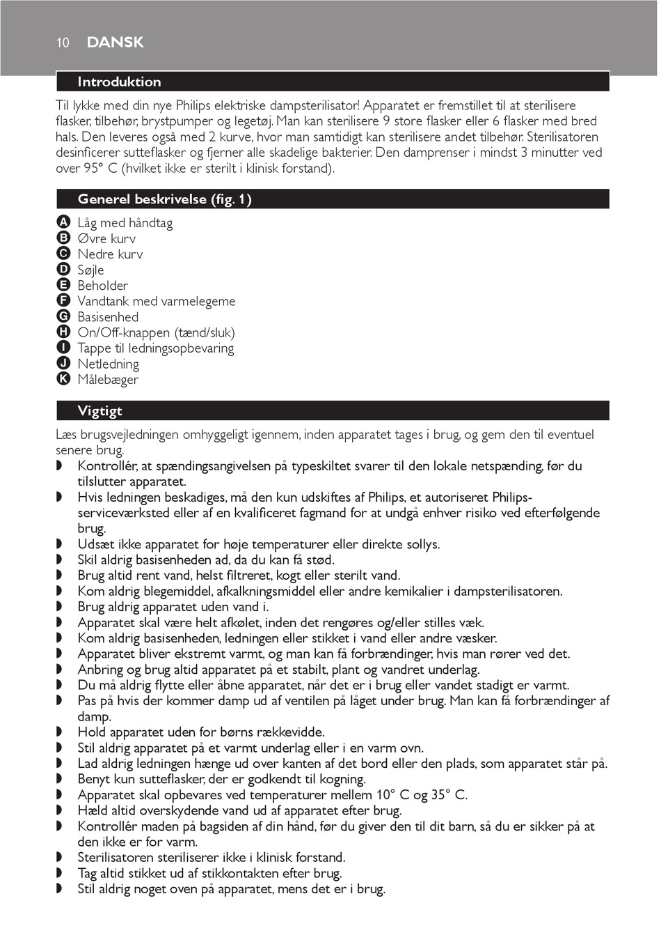 Til lykke med din nye Philips elektriske dampsterilisator! Apparatet er fremstillet til at sterilisere