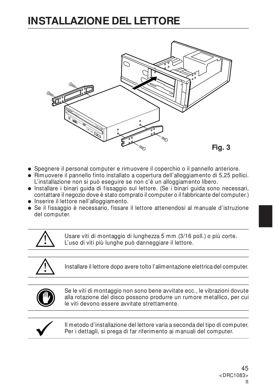 ÷ Se il fissaggio è necessario, fissare il lettore attenendosi al manuale d'istruzione