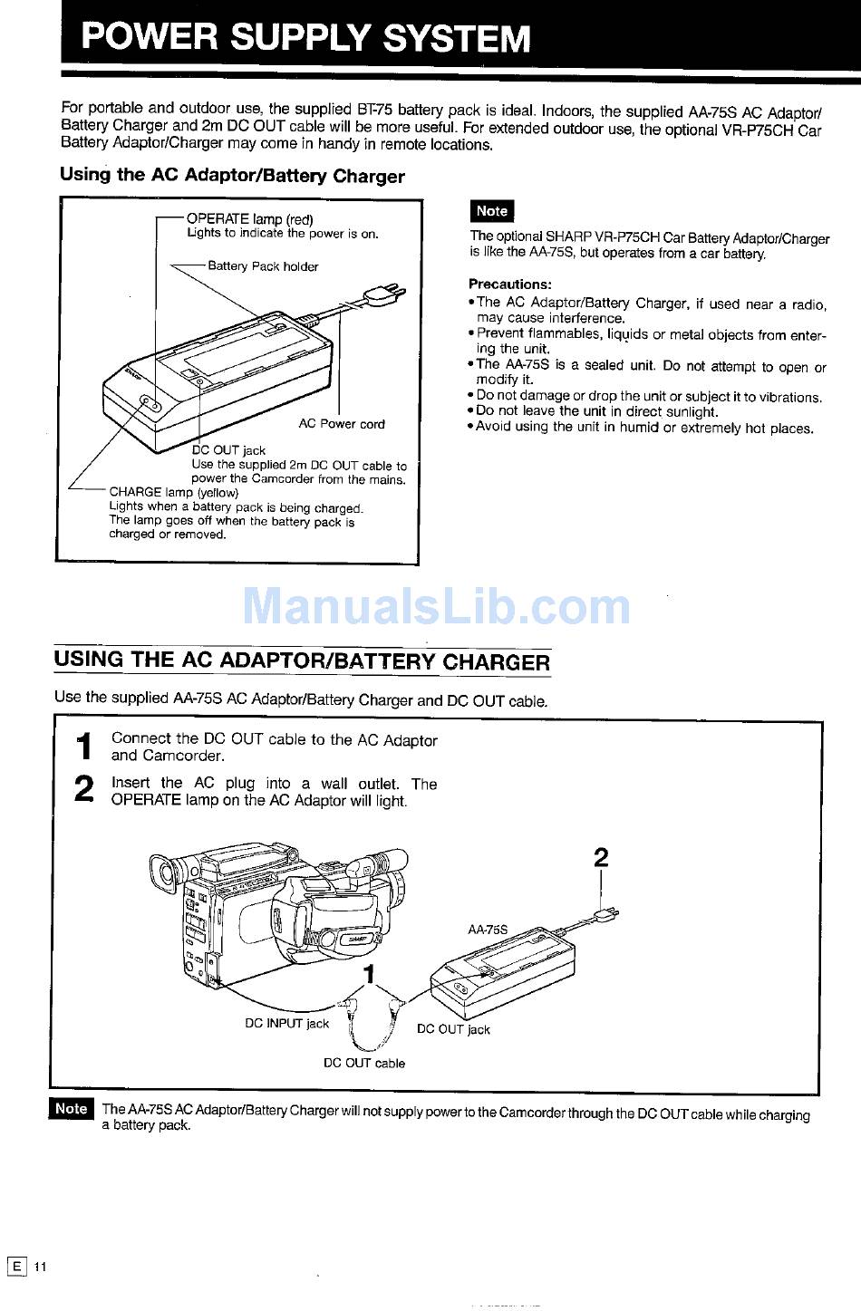 Power Supply System; Using The Ac Adaptor/Battery Charger - Sharp Vl-C780S Operation Manual