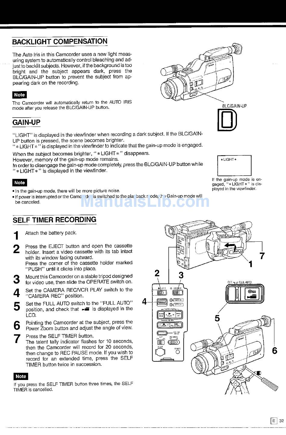 Backlight Compensation; Gain-Up; Self Timer Recording - Sharp Vl-C780S Operation Manual