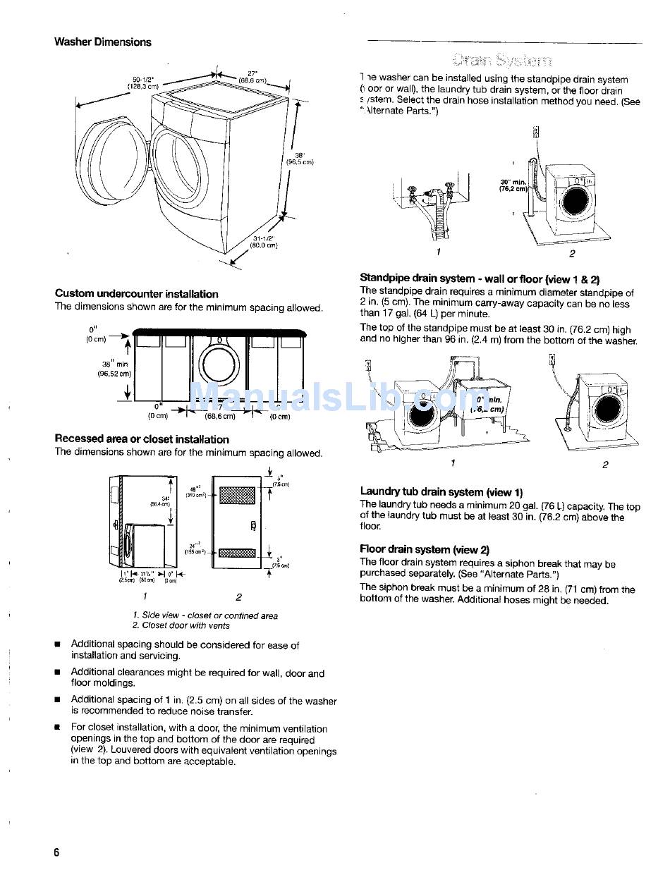 Additional spacing of 1 in. (2.5 cm) on all sides of the washer