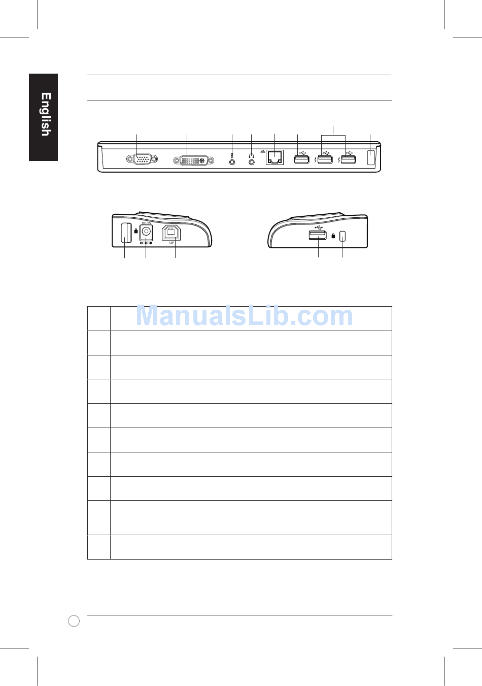 Insert the power adapter into this port to supply power to your docking station and