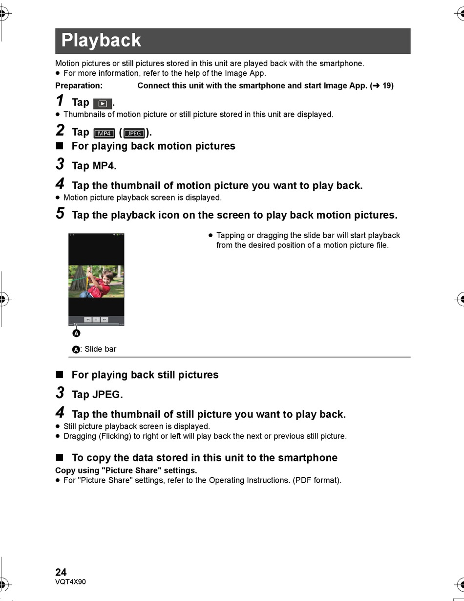 Motion pictures or still pictures stored in this unit are played back with the smartphone.