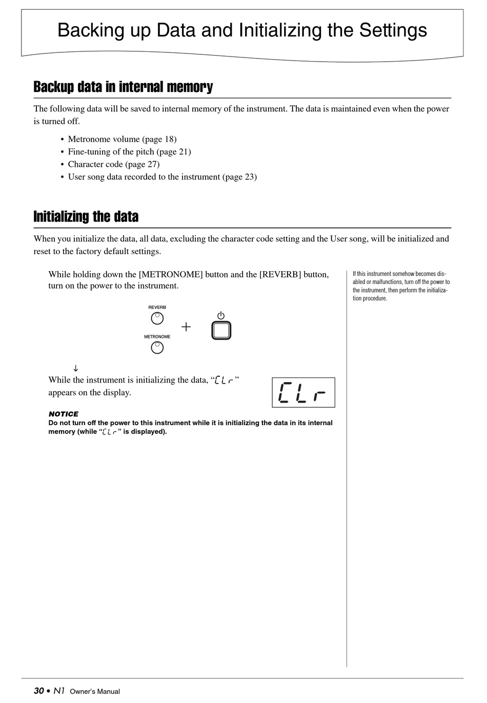 When you initialize the data, all data, excluding the character code setting and the User song, will be initialized and