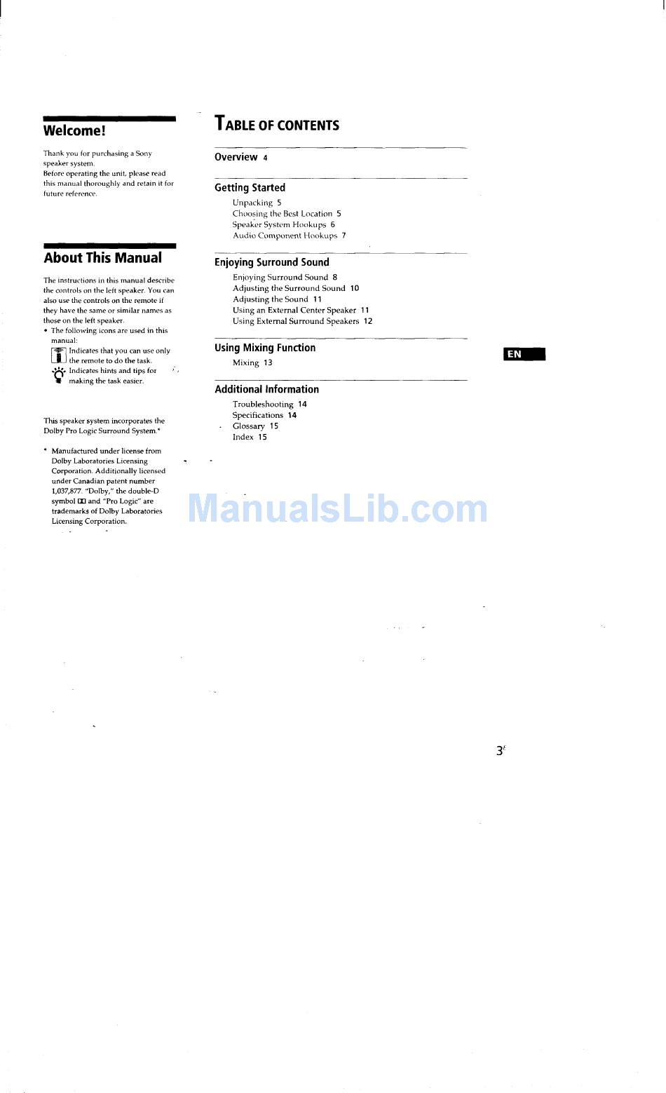 Table Of Contents - Sony Sava-7 Operating Instructions Manual