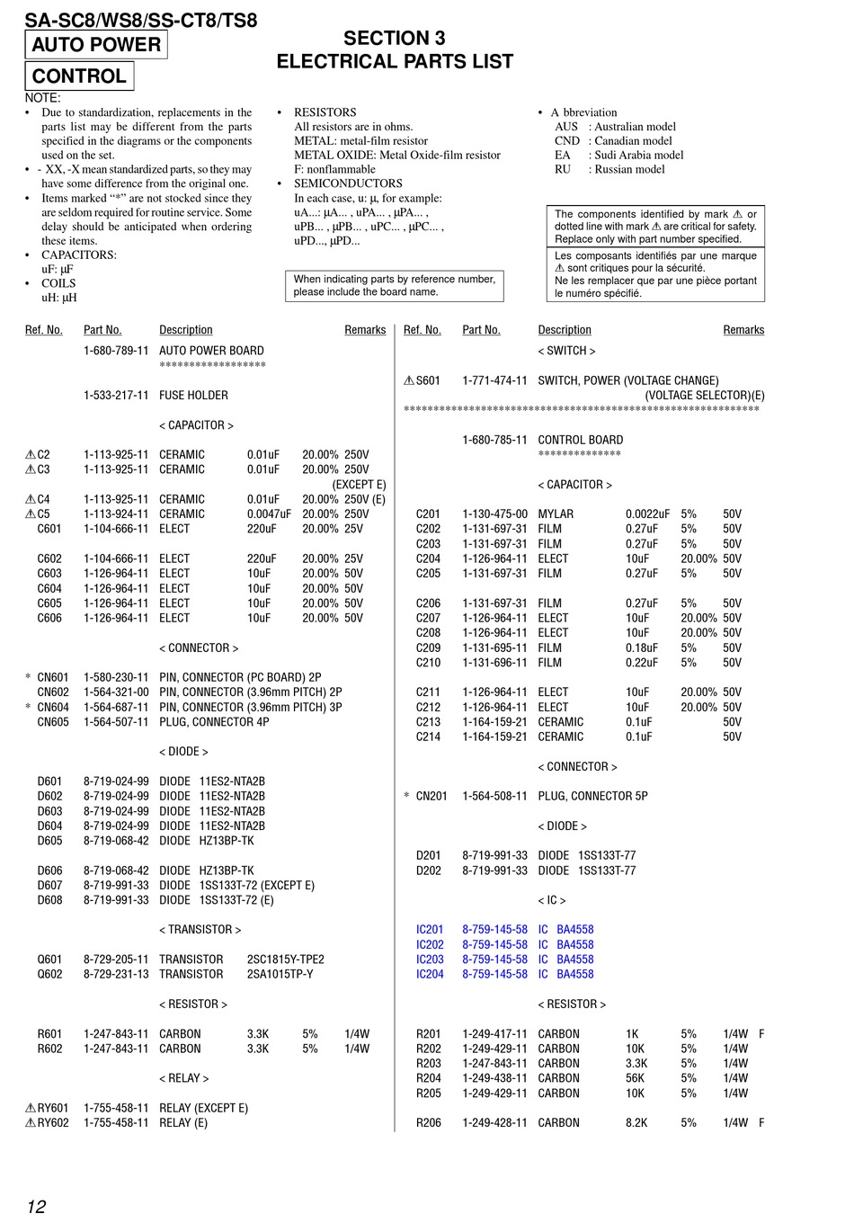 ELECTRICAL PARTS LIST