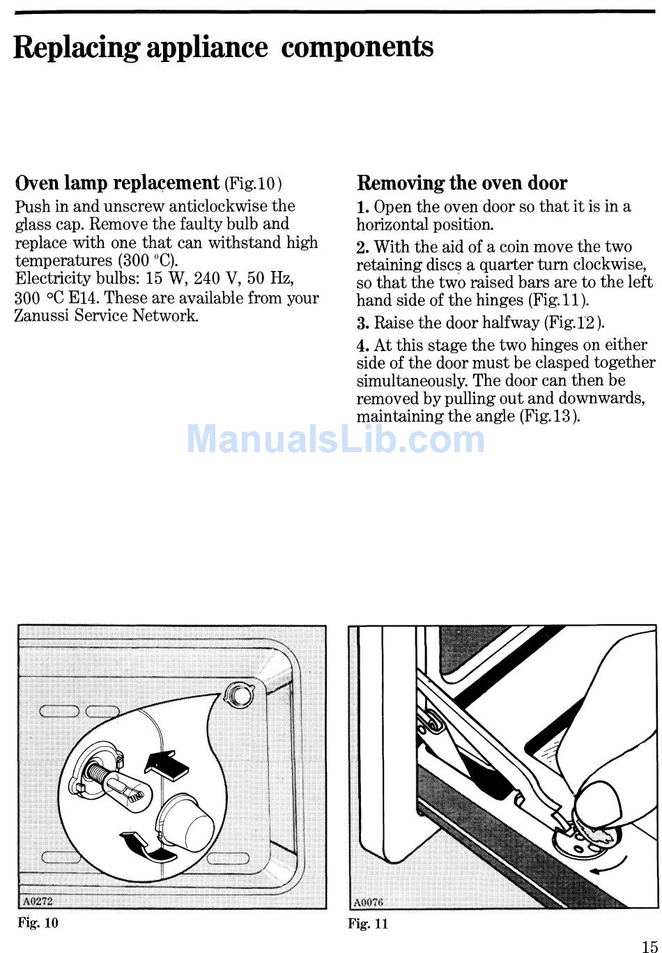 Replacing Appliance Components; Oven Lamp Replacement; Removing The Oven Door - Zanussi Fm 9232 Instructions For Use Manual