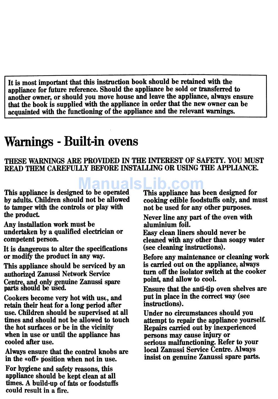 Warnings - Built-In Ovens - Zanussi Fm 9232 Instructions For Use Manual