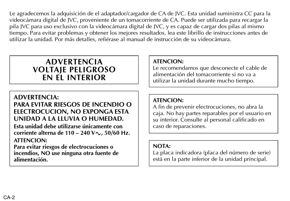 Le agradecemos la adquisición de el adaptador/cargador de CA de JVC. Esta unidad suministra CC para la