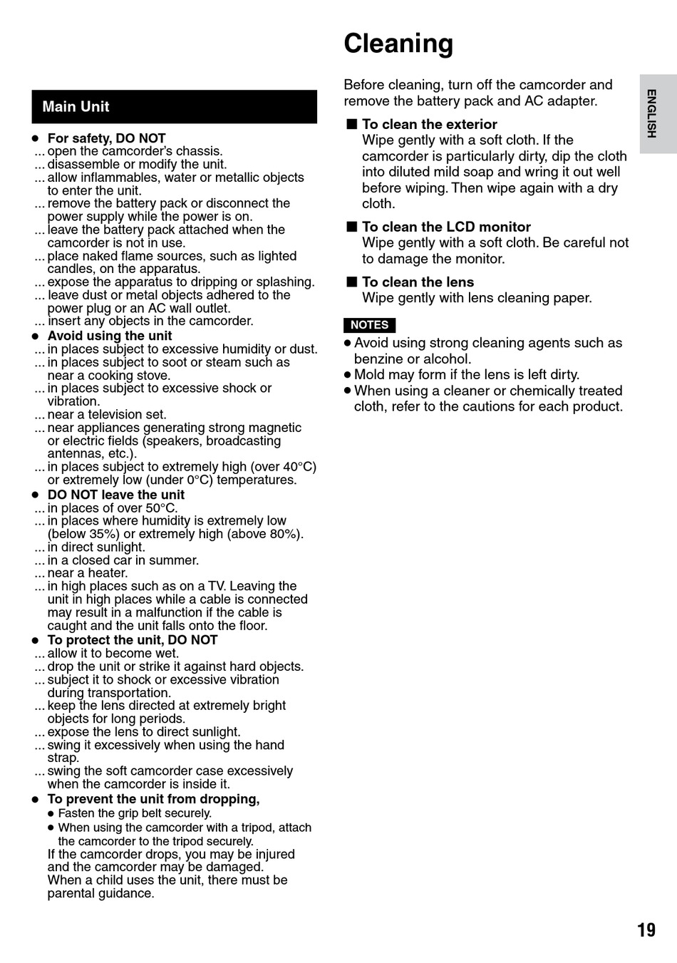 Before cleaning, turn off the camcorder and
