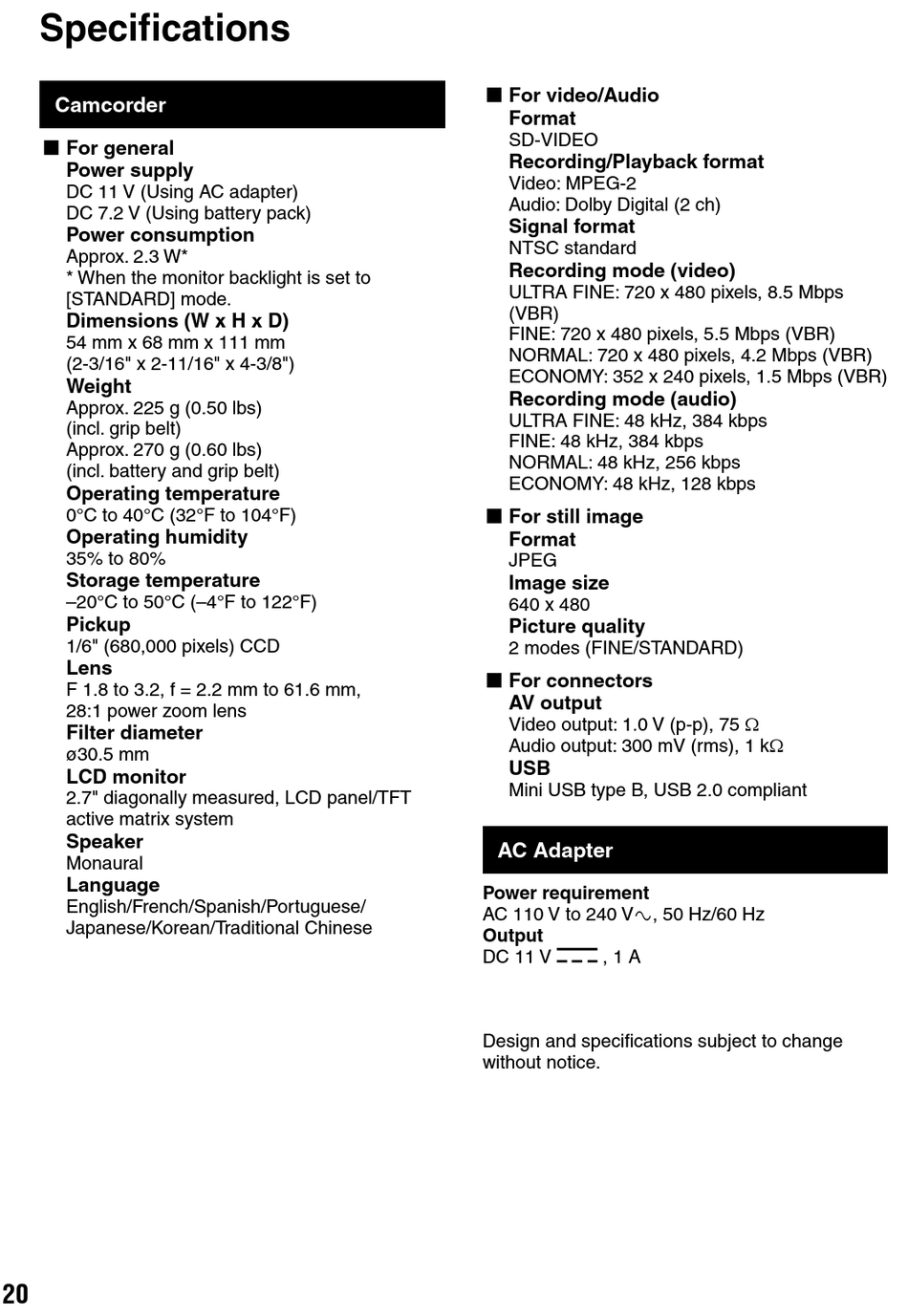 AC 110 V to 240 Vd, 50 Hz/60 Hz