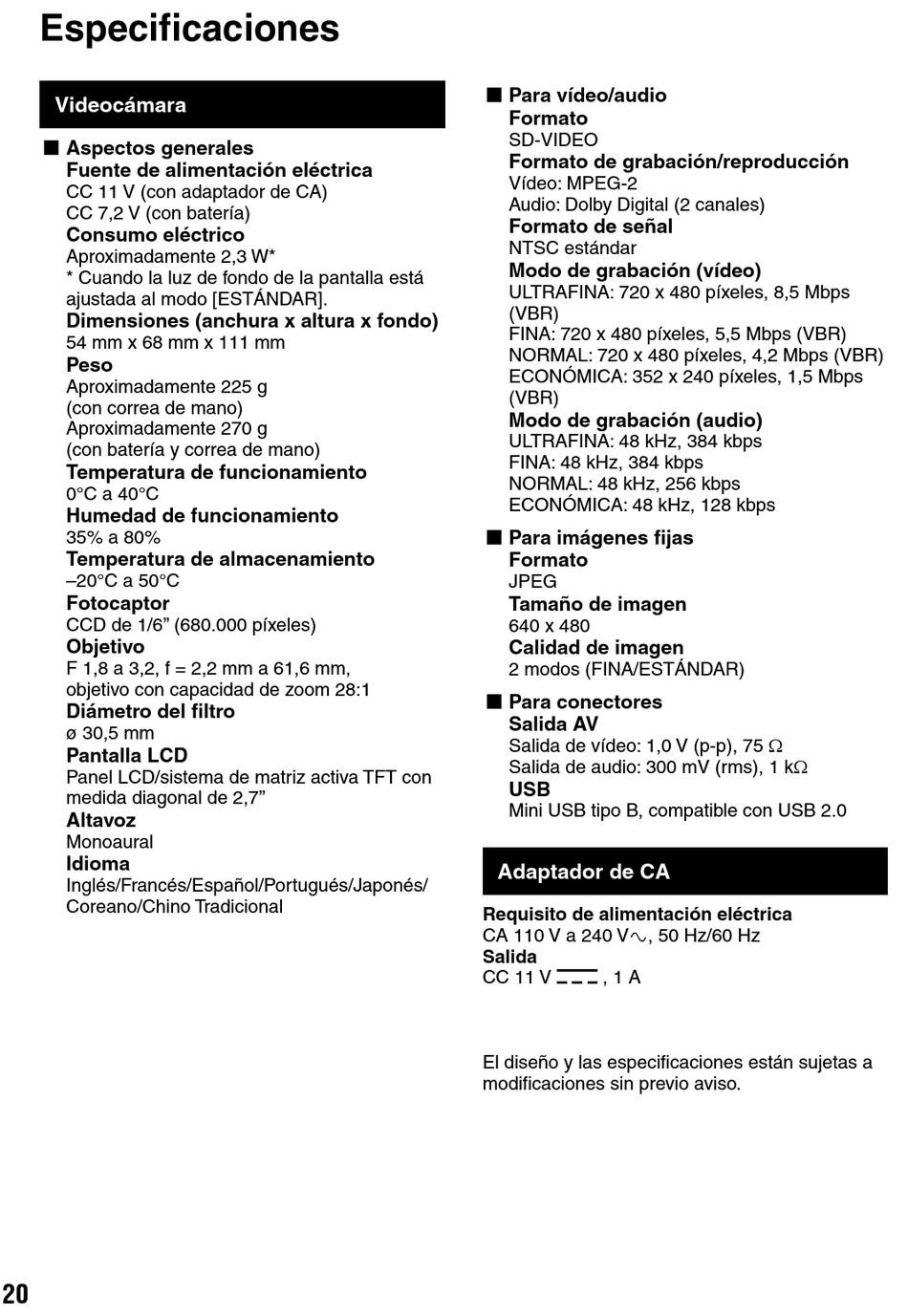 El diseño y las especificaciones están sujetas a