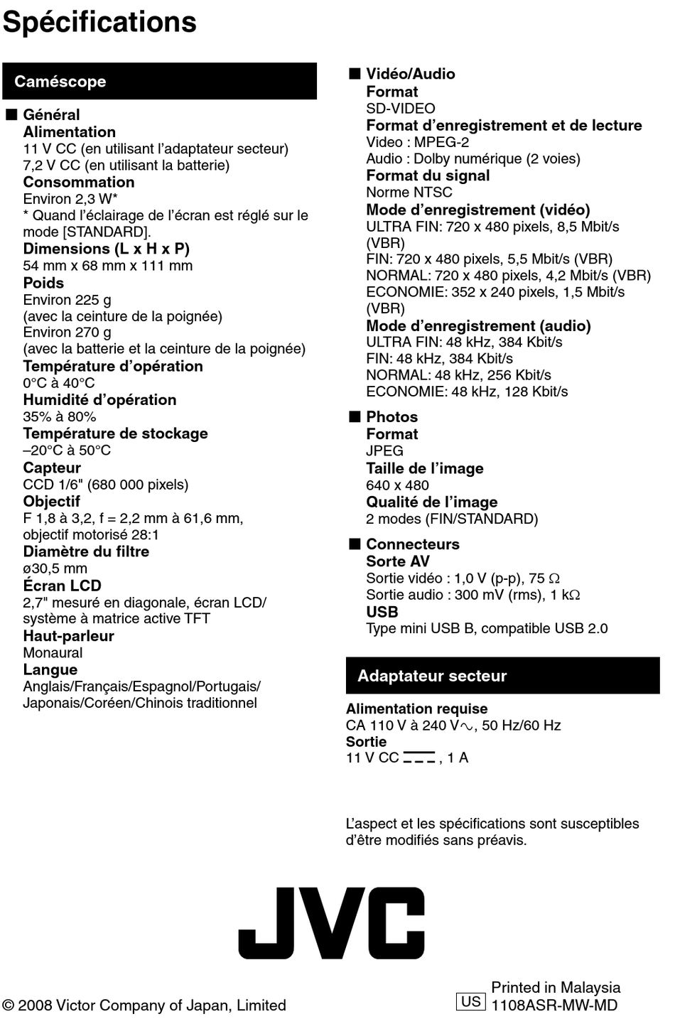 Sortie vidéo : 1,0 V (p-p), 75 Ω