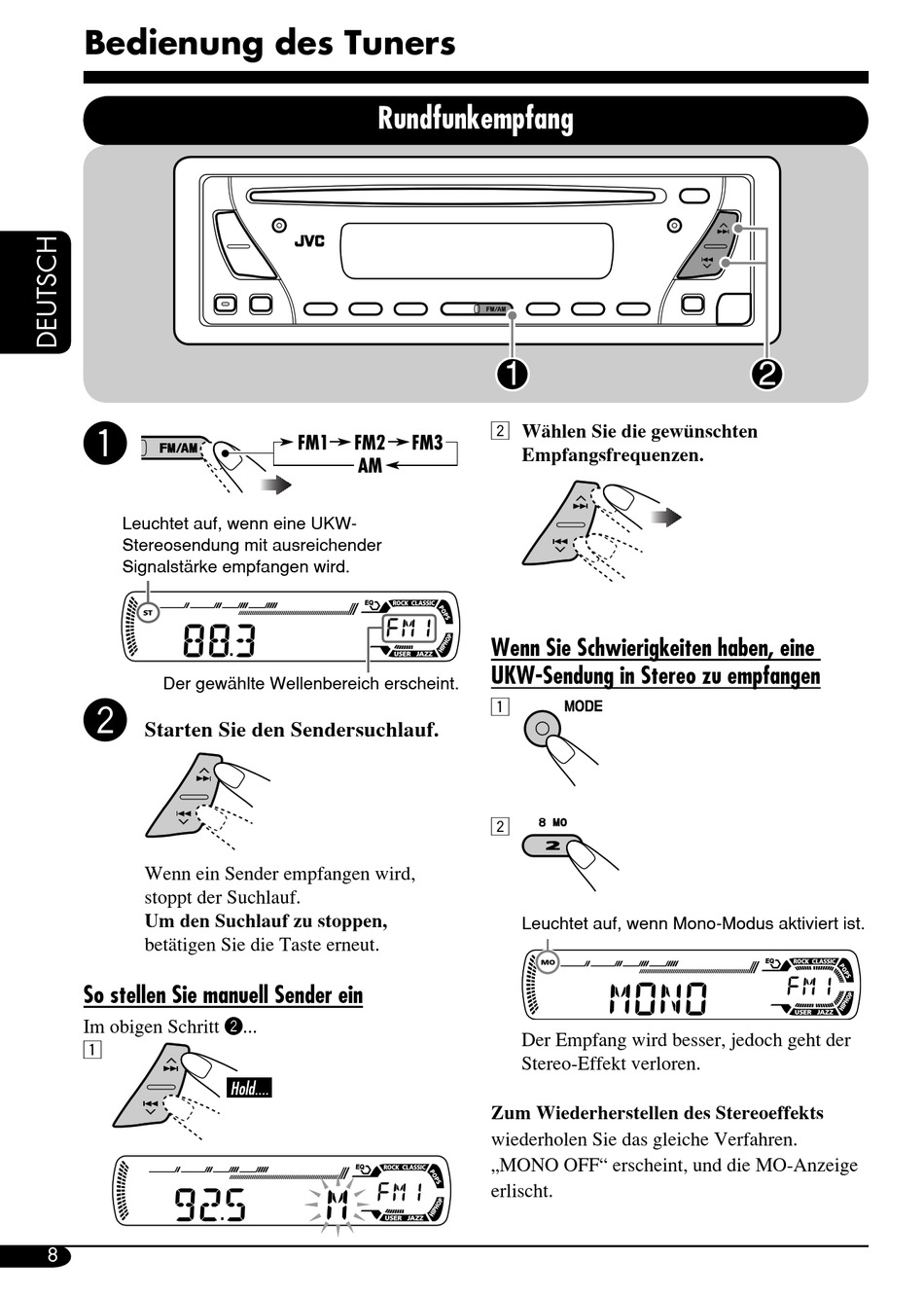 „MONO OFF" erscheint, und die MO-Anzeige