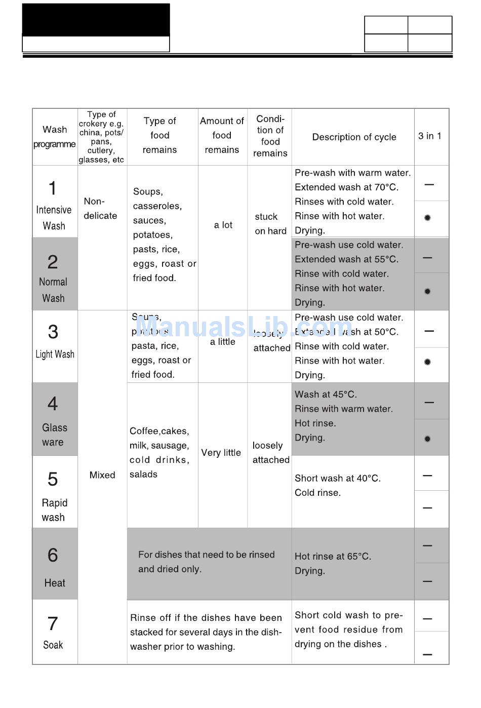 DW9-TFE3-F Wash Cycle Table