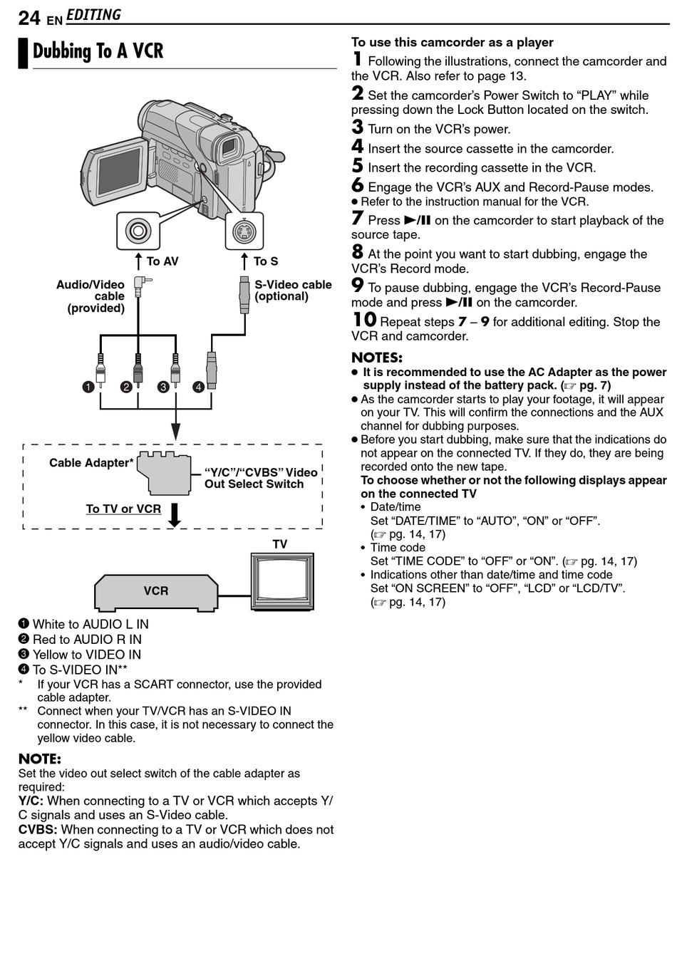 Y/C: When connecting to a TV or VCR which accepts Y/