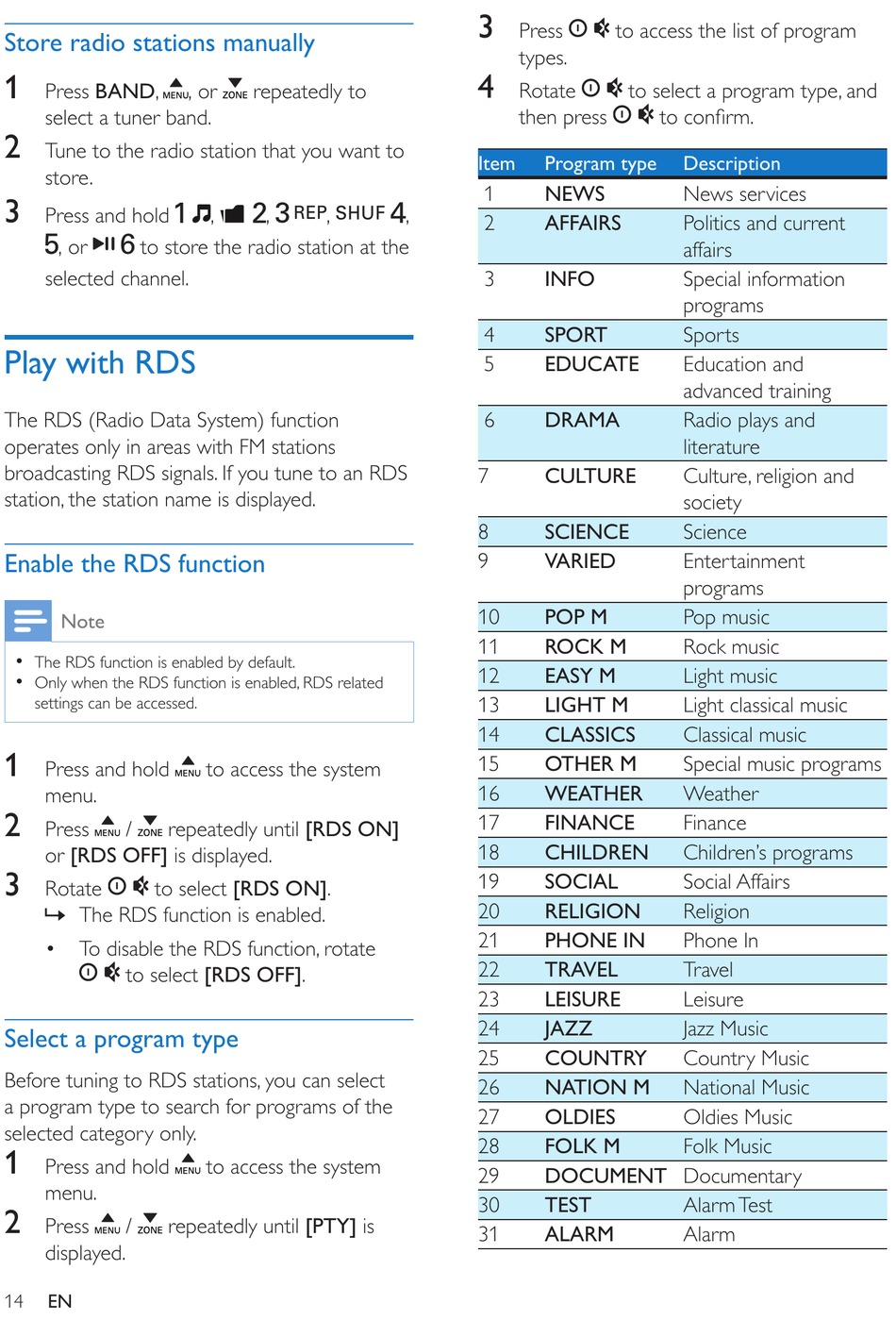 Before tuning to RDS stations, you can select