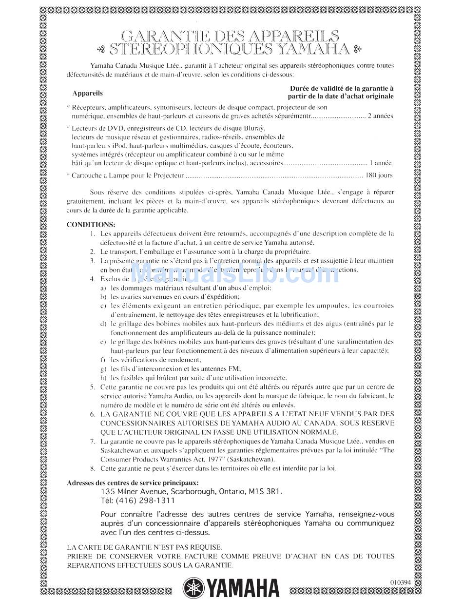 La .gar:1ntie ne couvre pas le appareils stereophoniques de Yamaha Canada Musique Ltce., vendus en