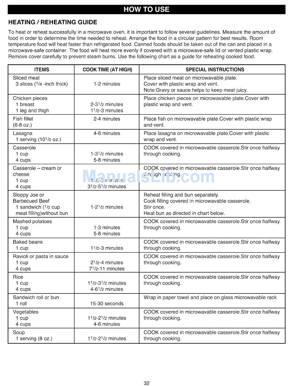 Remove cover carefully to prevent steam burns. Use the following chart as a guide for reheating cooked food.