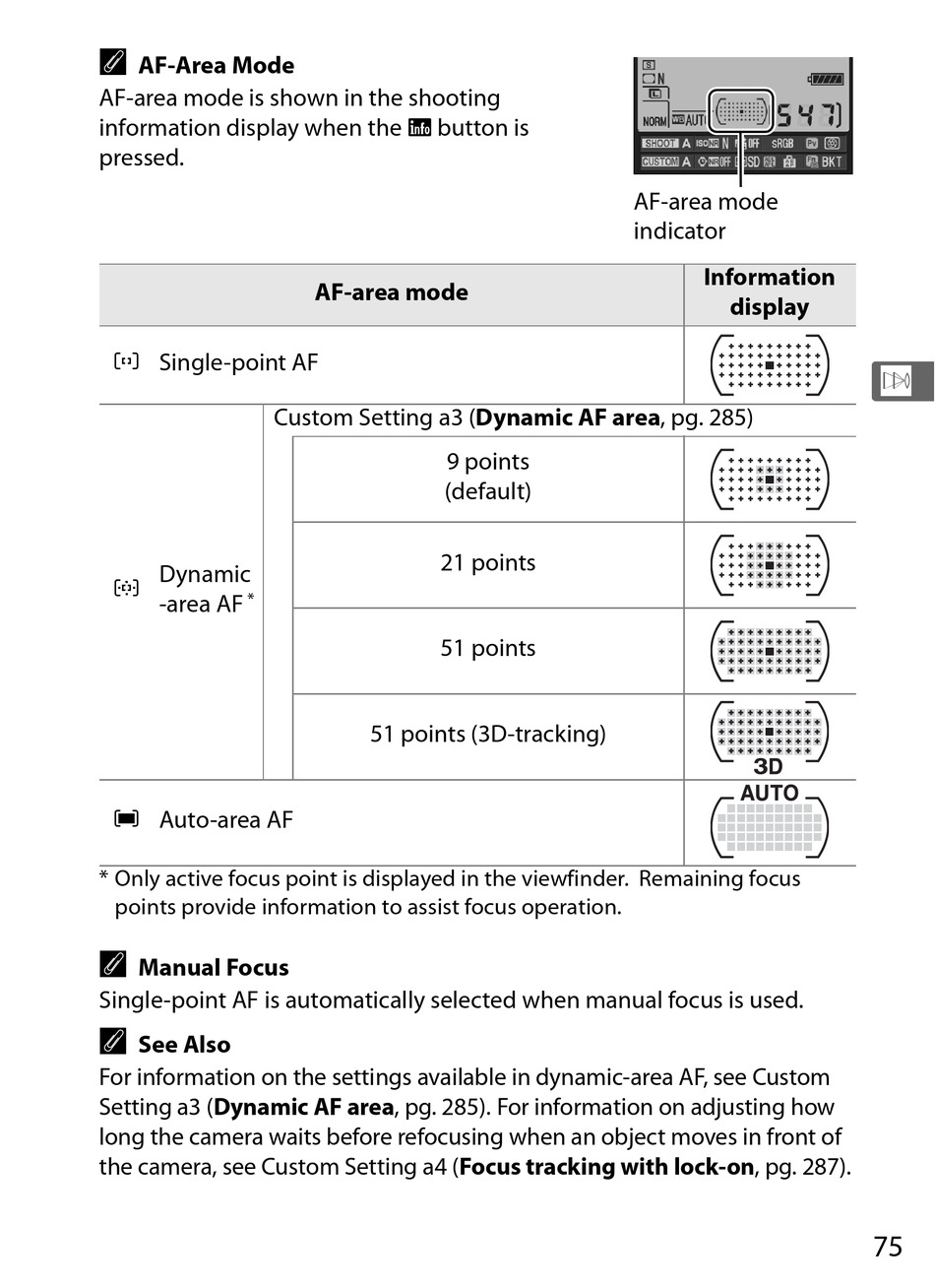 Setting a3 (Dynamic AF area, pg. 285). For information on adjusting how