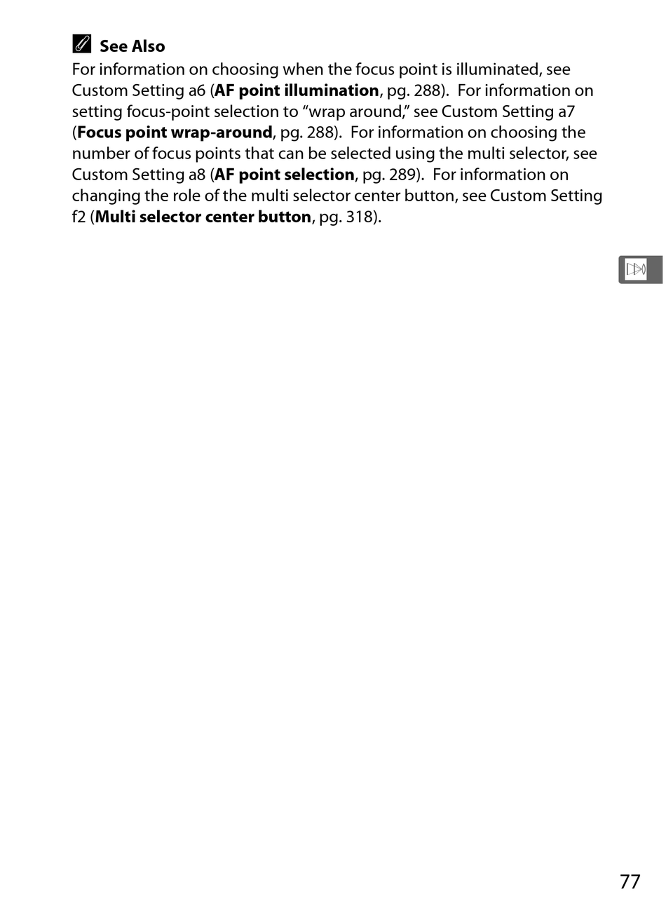 Custom Setting a8 (AF point selection, pg. 289). For information on