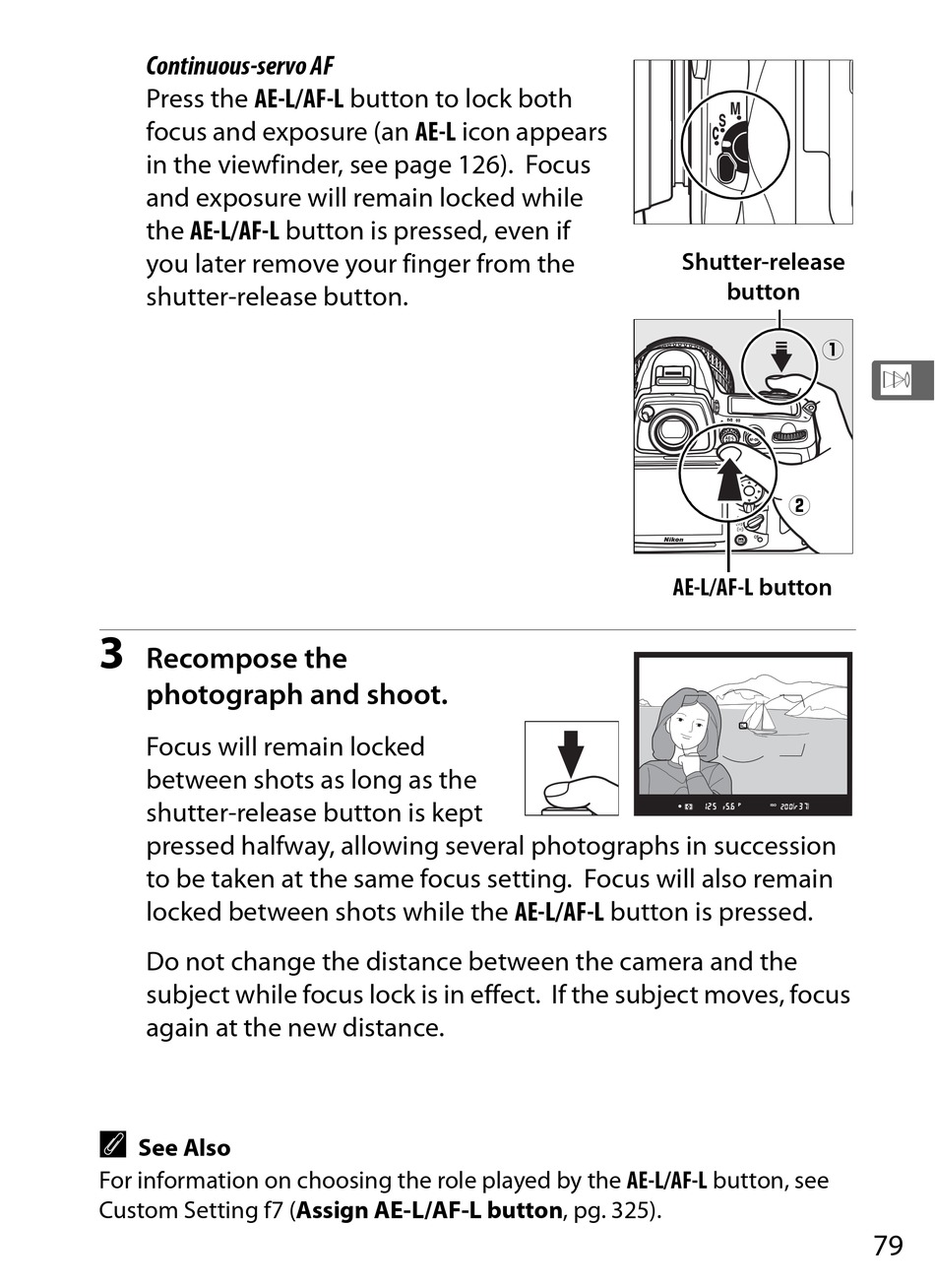 Custom Setting f7 (Assign AE-L/AF-L button, pg. 325).