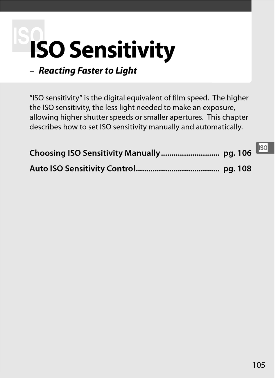 Choosing ISO Sensitivity Manually............................ pg. 106