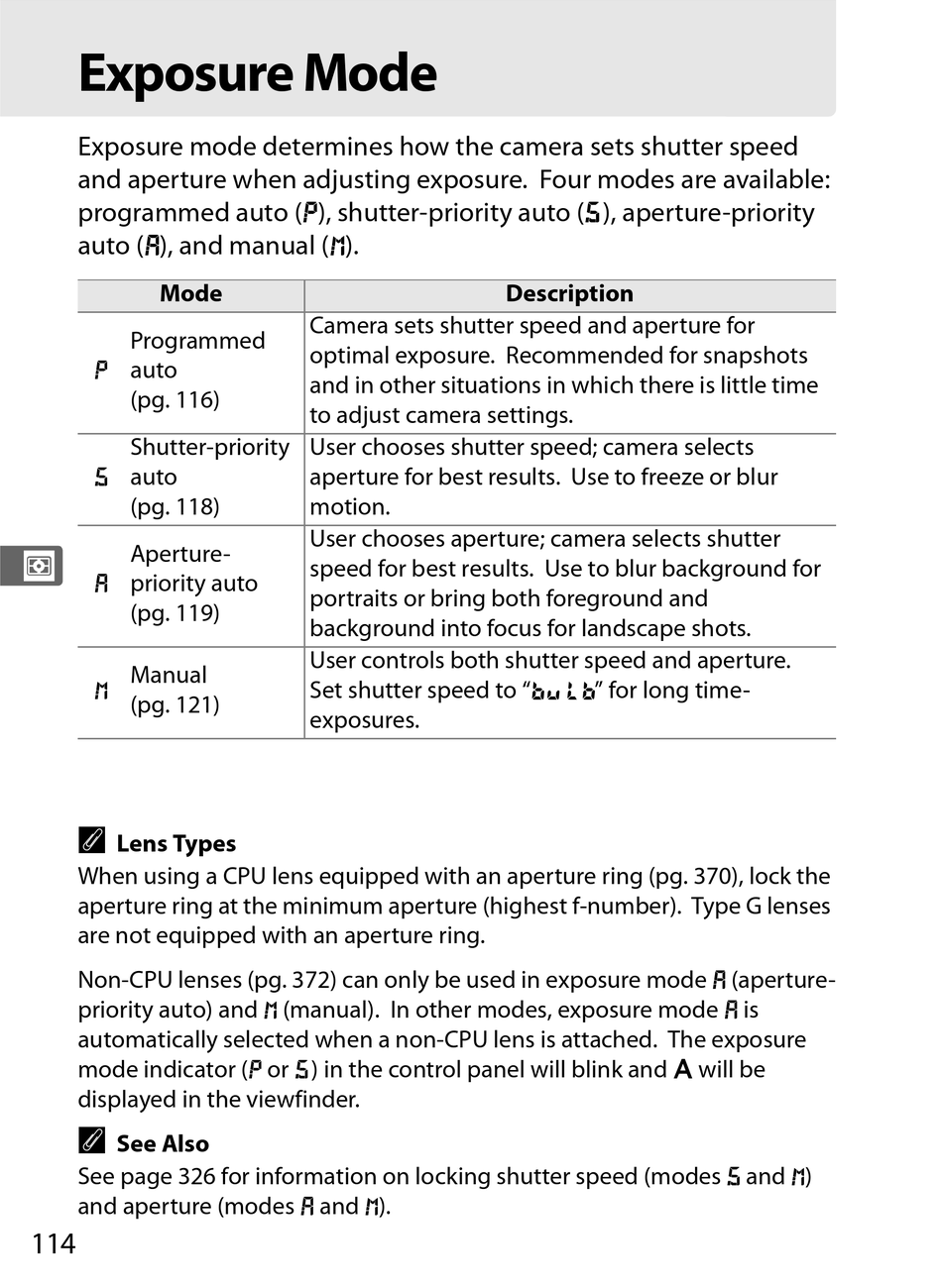 Non-CPU lenses (pg. 372) can only be used in exposure mode g (aperture-