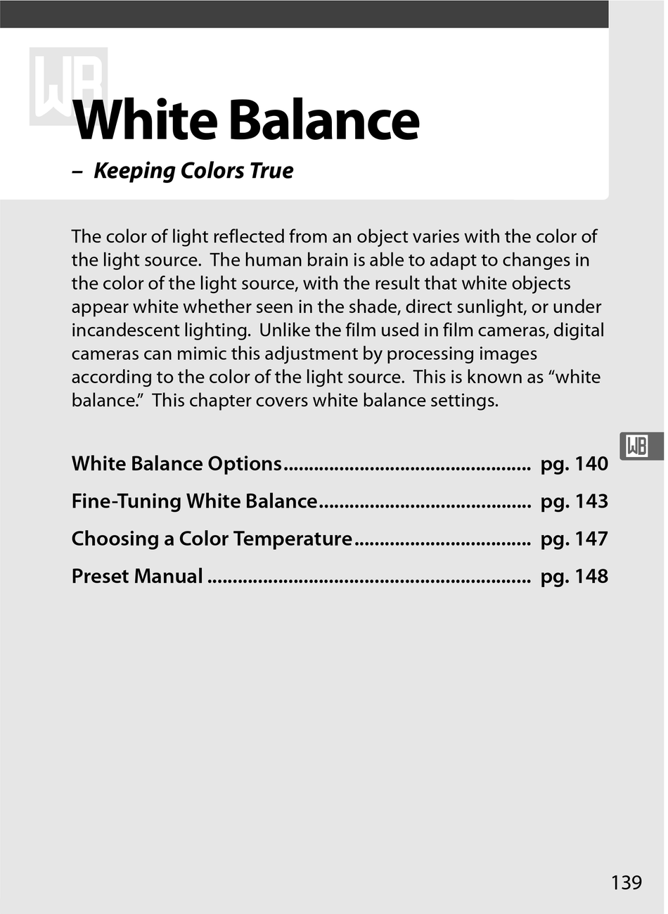 White Balance Options................................................. pg. 140