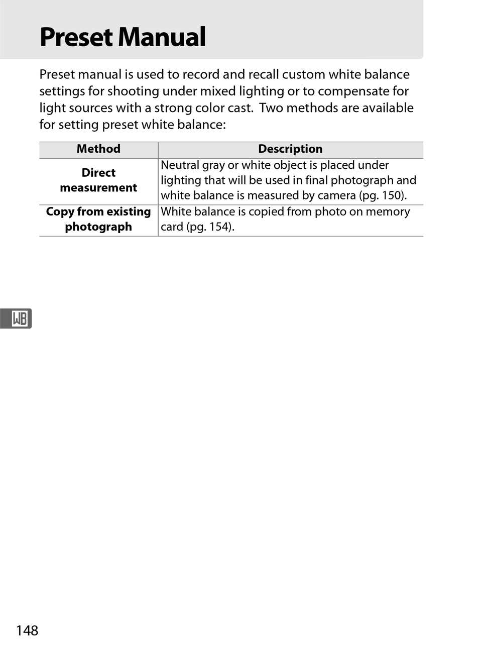 Preset manual is used to record and recall custom white balance