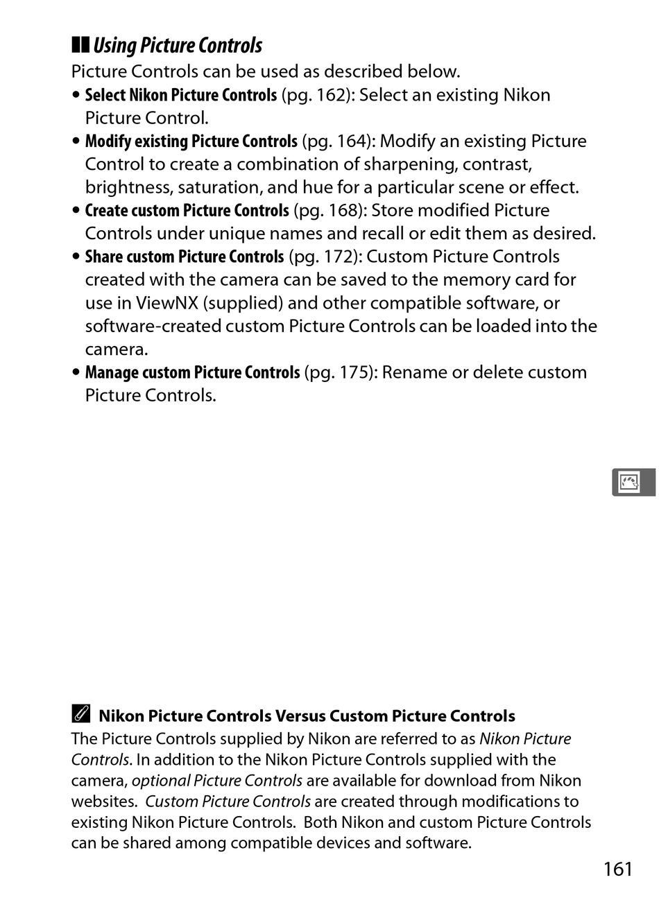 • Modify existing Picture Controls (pg. 164): Modify an existing Picture