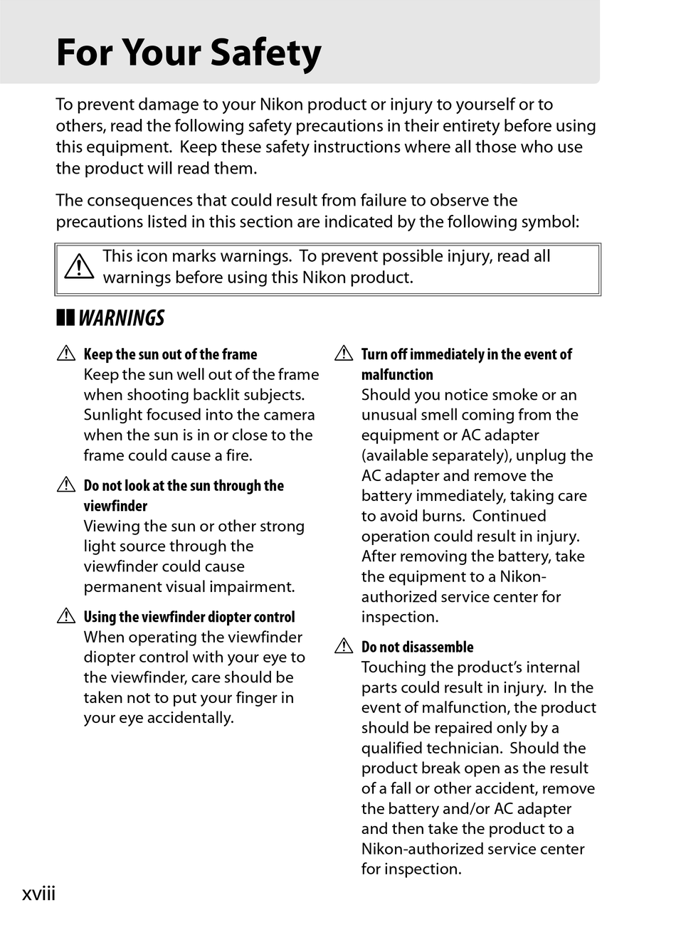To prevent damage to your Nikon product or injury to yourself or to
