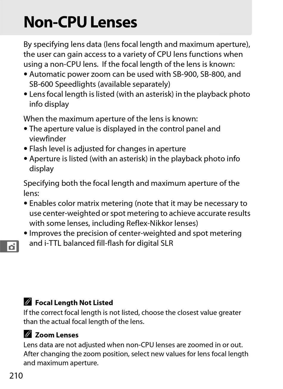Lens data are not adjusted when non-CPU lenses are zoomed in or out.