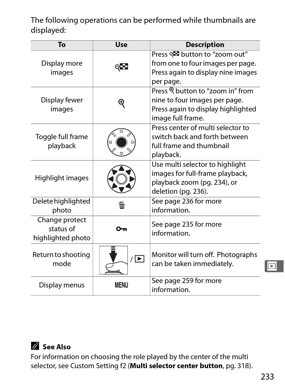 selector, see Custom Setting f2 (Multi selector center button, pg. 318).