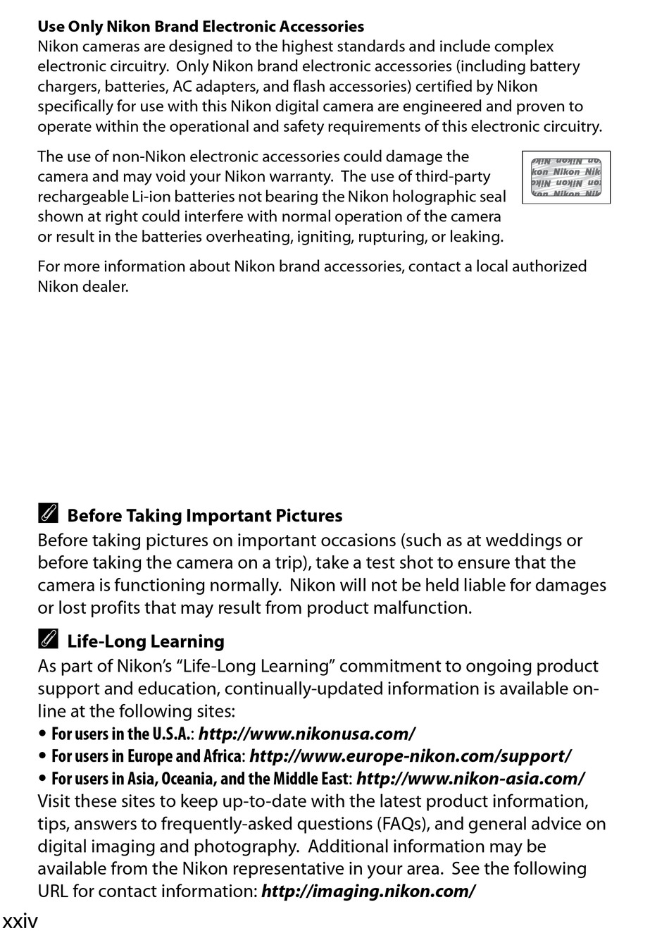 Use Only Nikon Brand Electronic Accessories