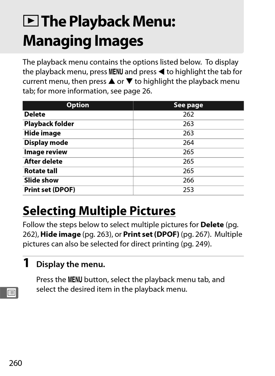 262), Hide image (pg. 263), or Print set (DPOF) (pg. 267). Multiple