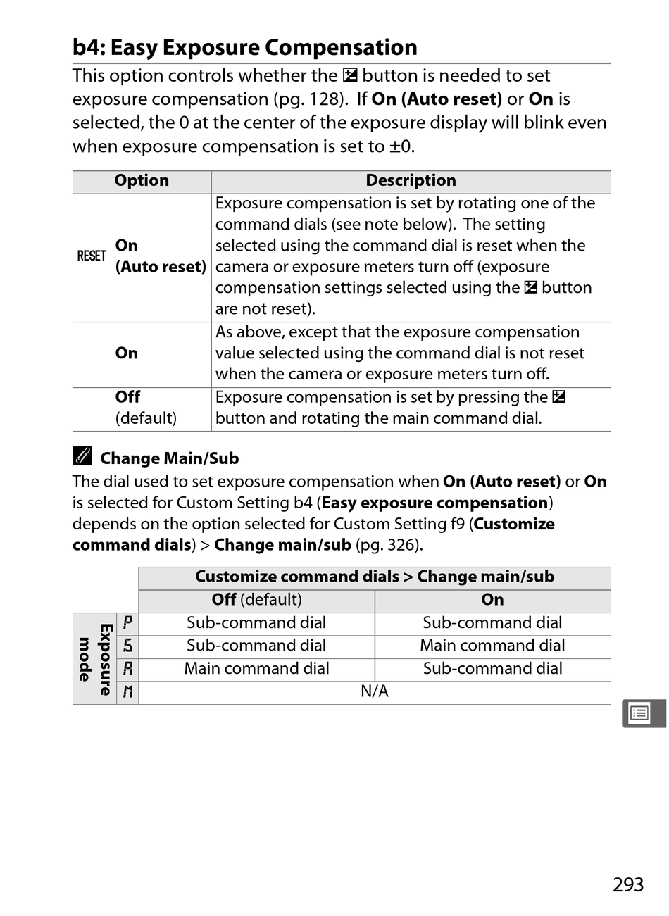exposure compensation (pg. 128). If On (Auto reset) or On is