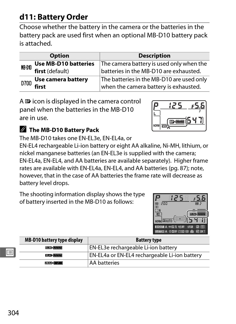rates are available with EN-EL4a, EN-EL4, and AA batteries (pg. 87); note,