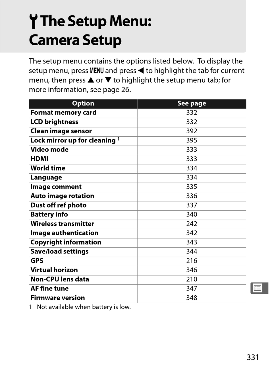 menu, then press 1 or 3 to highlight the setup menu tab; for