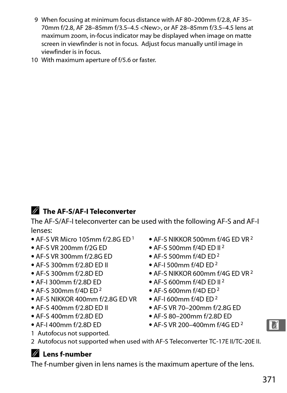 The AF-S/AF-I teleconverter can be used with the following AF-S and AF-I