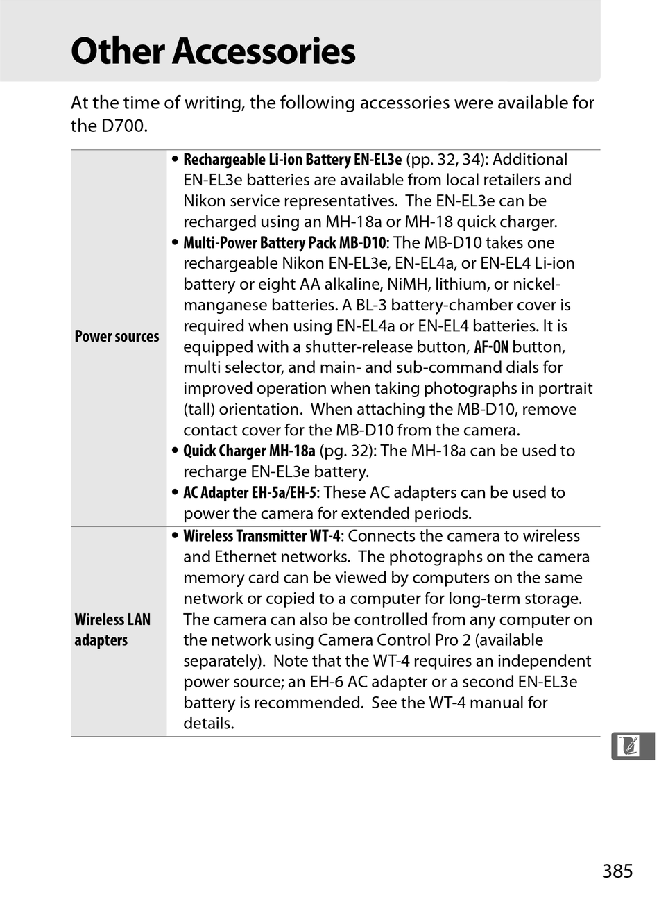 • Rechargeable Li-ion Battery EN-EL3e (pp. 32, 34): Additional