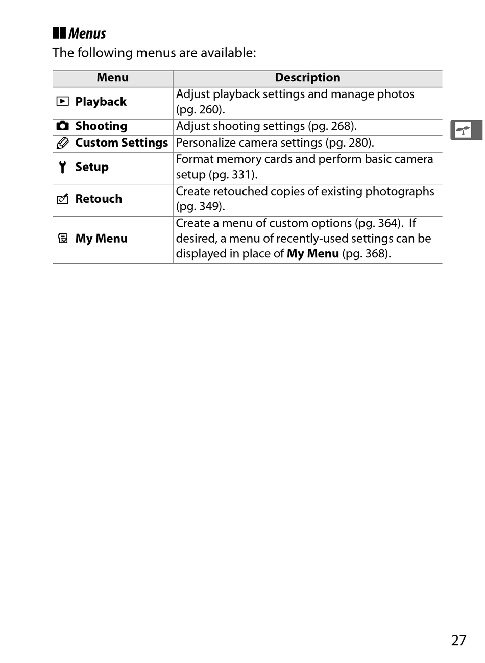 A Custom Settings Personalize camera settings (pg. 280).
