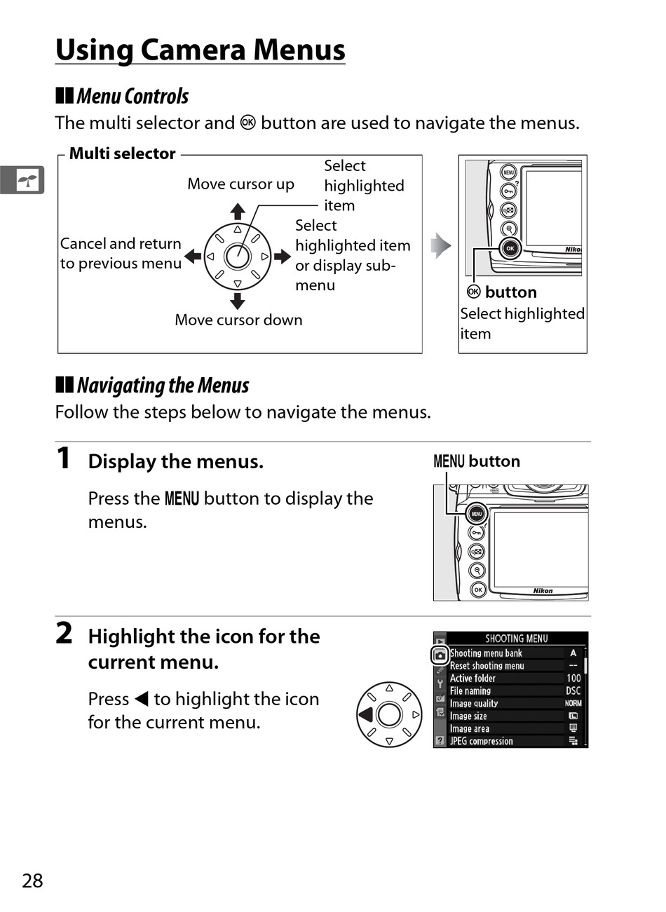 The multi selector and J button are used to navigate the menus.